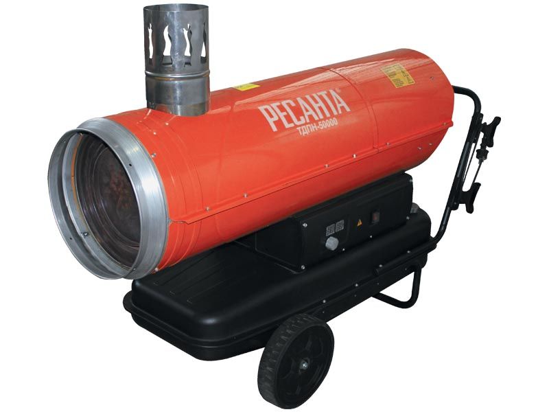 Дизельная тепловая пушка РЕСАНТА ТДПН-50000 - функциональный обогреватель с непрямым нагревом для отопления складских, строительных и других помещений. При использовании непрямого нагрева воздух не смешивается с продуктами горения солярки. Для передачи тепла предусмотрен специальный теплообменник, который нагревает воздух. Сам теплообменник накаляется сгоревшим топливом, а все продукты горения, пройдя через него, уходят в смонтированную дымовую трубу. Это позволяет использовать подобные устройства для монтажа потолочных покрытий натяжного плана.