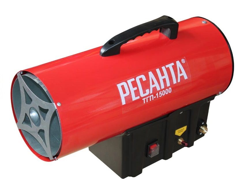 Газовая тепловая пушка РЕСАНТА ТГП-15000 – воздухонагреватель, работающий на сжиженном газовом топливе. Топливо необходимо для получения горячей атмосферы в камере сгорания, а электроэнергия, подводимая к устройству, необходима для питания вентилятора, нагнетающего воздух, и для функционирования автоматики. Газовые пушки прямого нагрева являются простой и надёжной конструкцией без дымохода, где горячий воздух из устройства поступают в помещение.