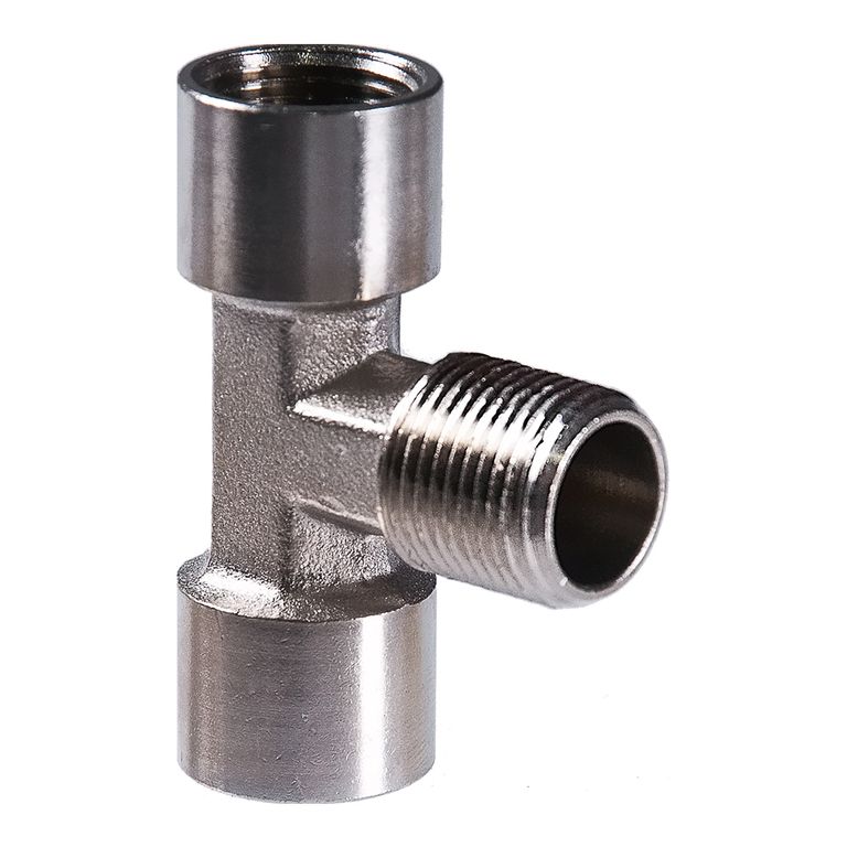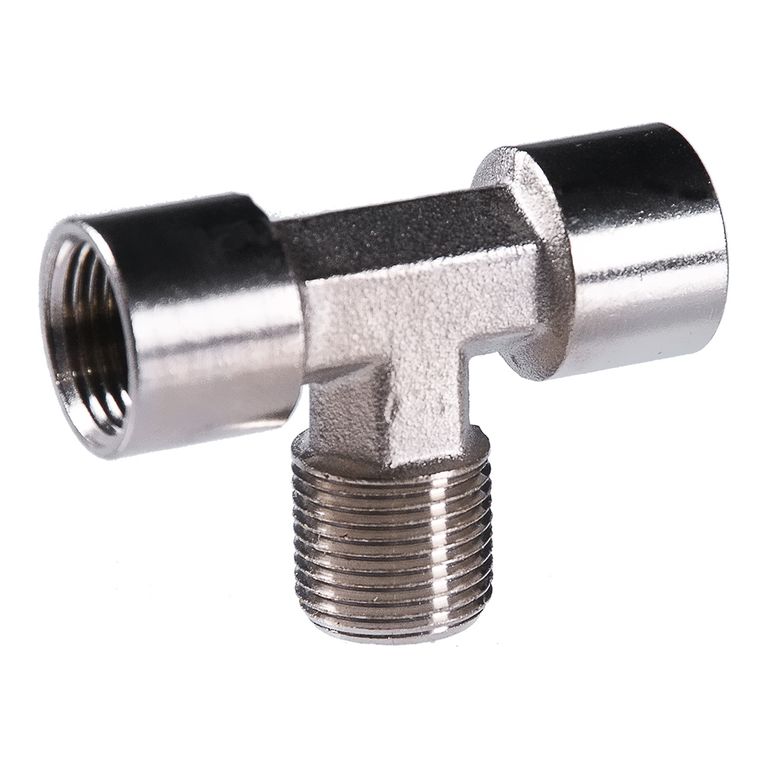 T-образный переходник (тройник) позволяет подсоединить к пневмомагистрали дополнительный участок. Крепление - резьба 3/8". Упаковка блистер.