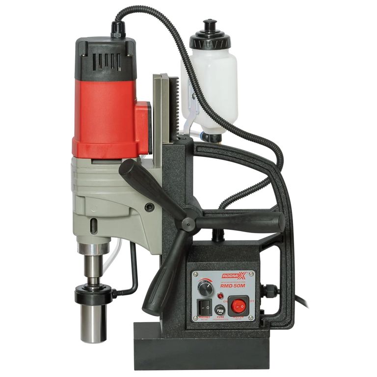 Металлорежущий магнитный станок среднего класса. Шпиндель Конус Морзе 2 позволяет применять различную оснастку. Направляющие «ласточкин хвост» перемещают привод относительно станины. Данная опция очень удобна для сверления отверстий ниже базовой поверхности. Мощность электроинструмента 1.62 кВт.