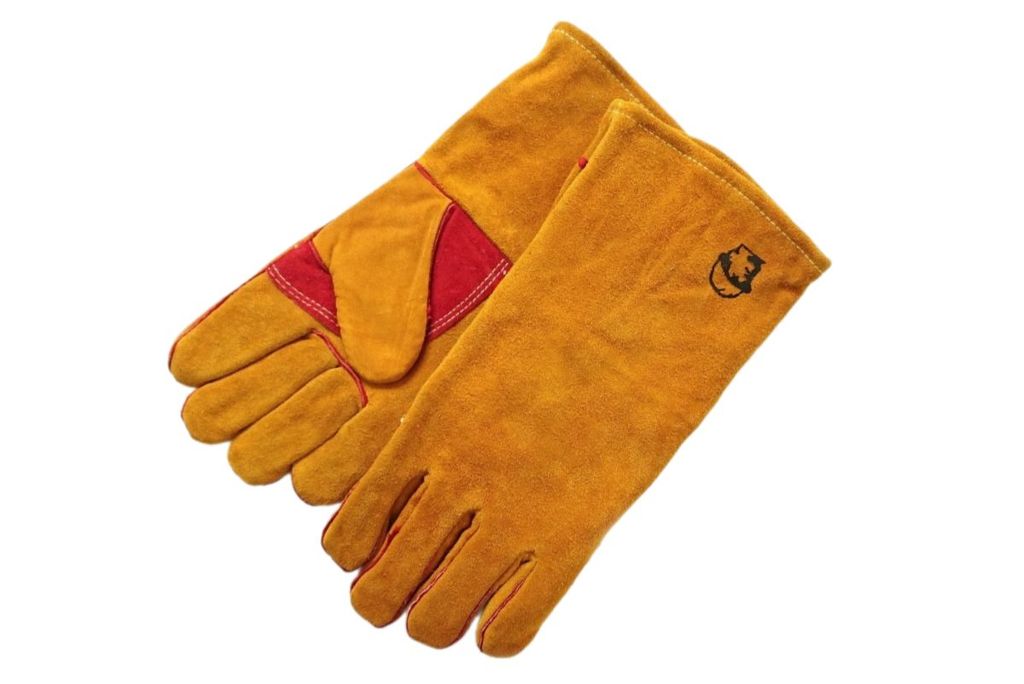 Краги из высококачественного желтого спилка (толщина 1,2-1,3мм), пятипалые. Ладонь и большой палец усилены дополнительным слоем спилка. Подкладка из плотной 100% хлопковой ткани, на тыльной и ладонной части дополнительный термоизолирующий слой флиса. Швы усилены спилковыми вставками и прошиты огнеупорной нитью KEVLAR.