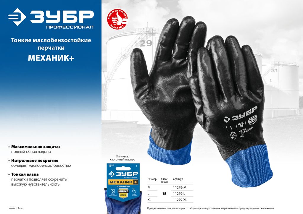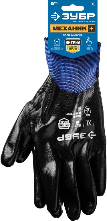 ЗУБР МЕХАНИК+, L (9), перчатки с полным нитриловым обливом, маслобензостойкие, 15 класс, Профессионал (11279-L)
